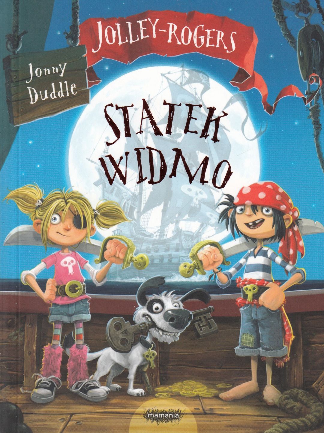 Uwaga, szczury lądowe, nadciąga piracka rodzina Jolley-Rogers! Jonny Duddle, znakomity rysownik i autor książek, zaprasza do pełnego humoru i zabawnych przygód świata piratów. Podczas każdej pełni księżyca na wybrzeżu można zaobserwować tajemniczy statek. Następnego dnia z całego miasta znikają złoto i kosztowności. Czy Matylda i Jim odzyskają skradzione łupy, zanim księżyc wejdzie w kolejną fazę? A może utkną na widmowym statku aż do kolejnej pełni?