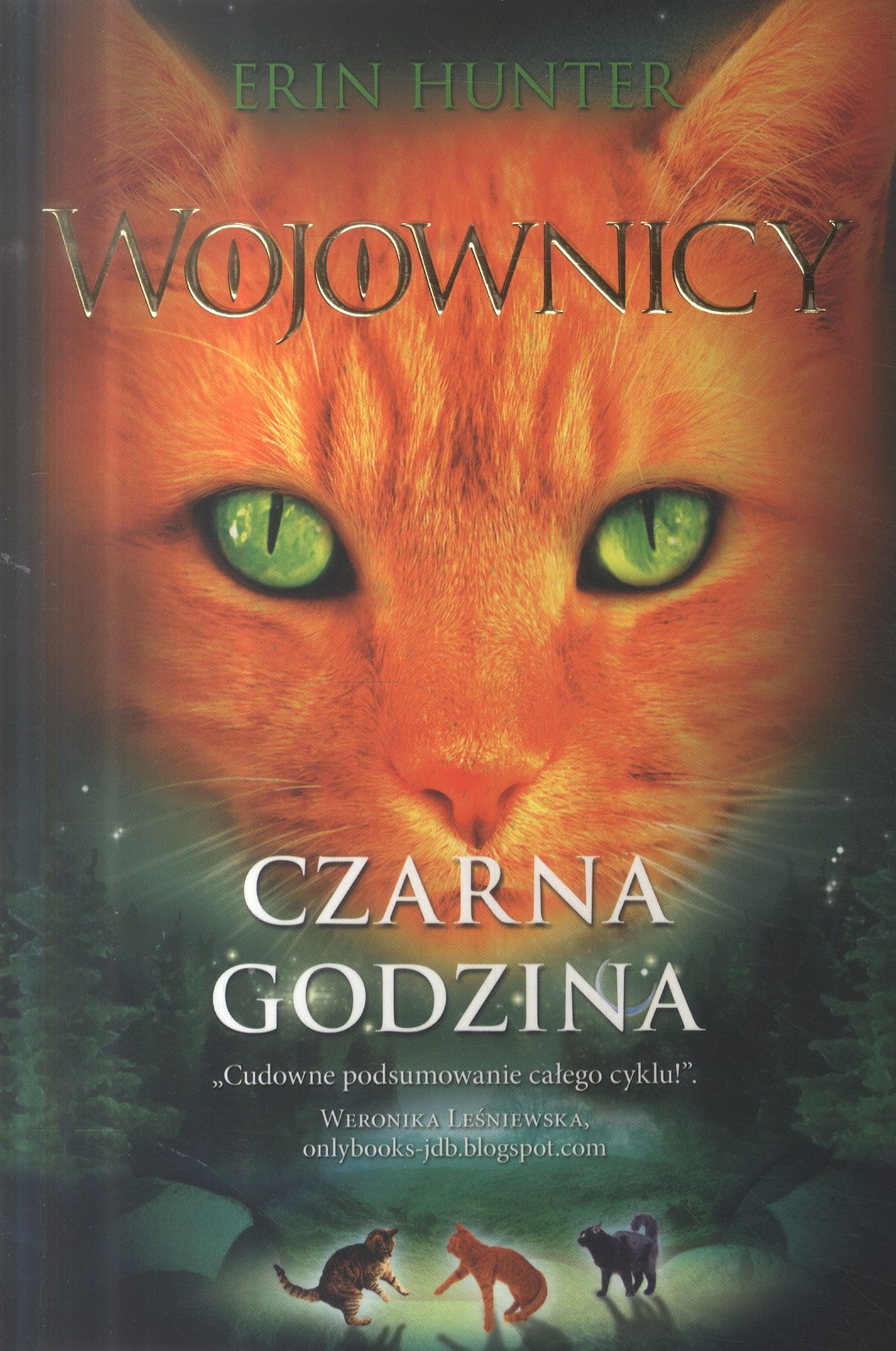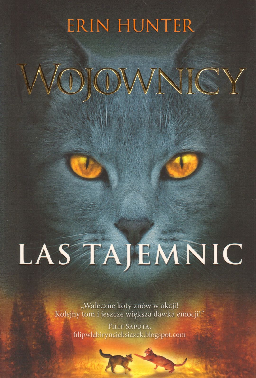 Pierwszy tom cyklu. Od wieków cztery klany wojowniczych kotów dzieliły las według praw ustanowionych przez przodków. Jednak jeden z nich odrzucił odwieczny porządek, stwarzając zagrożenie dla pozostałych. Bezwzględne koty z Klanu Cienia otaczają siedlisko walecznych, choć mniej licznych kotów z Klanu Pioruna. Błękitna Gwiazda, ich przywódczyni, i jej dumni wojownicy - Lwie Serce i Tygrysi Pazur - nie poddadzą się bez walki, zdecydowani bronić za wszelką cenę swoich pobratymców i młodych. Gdy sytuacja wydaje się beznadziejna, w lesie pojawia się zwyczajny, domowy kot, o którym mówiło proroctwo i który odmieni losy tych ziem. Kolejny tom nosi tytuł "Ogień i lód".