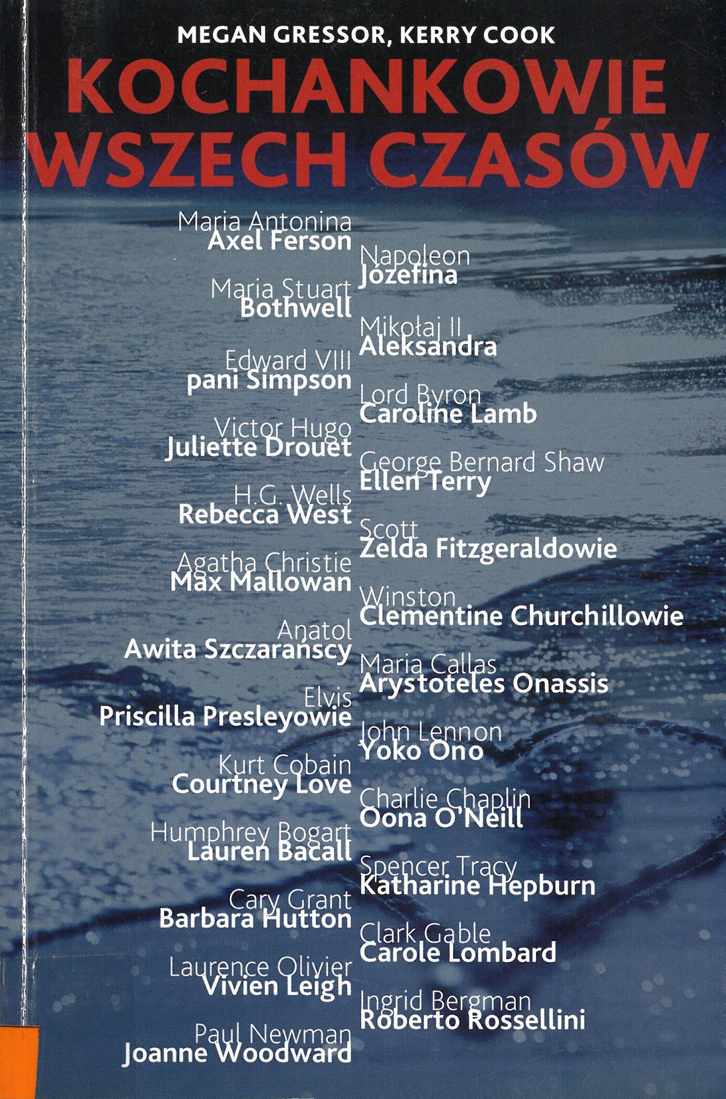 Maria Antonina (elektorowa saska ; 1724-1780) Ferson, Axel Napoleon I (cesarz Francuzów ; 1769-1821) Józefina (cesarzowa Francuzów ; 1763-1814) Nelson, Horatio (1758-1805) Hamilton, Emma (1765-1815) Maria Stuart (królowa Szkocji ; 1542-1587) Bothwell, James (ok.1534-1587) Ludwik XIV (król Francji ; 1638-1715) Montespan, Françoise Athénaïs de Rochechouart de Mortemart (1640-1707) Mikołaj II (cesarz Rosji ; 1868-1918) Aleksandra (wielka księżna rosyjska ; 1830-1911) Ludwik I (król Bawarii ; 1786-1868) Montez, Lola (1818-1861) Edward VIII (król Wielkiej Brytanii i Irlandii ; 1894-1972) Simpson, Elizabeth B Byron, George Gordon (1788-1824) LLamb, Caroline (1785-1828) Hugo, Victor (1802-1885) Drouet, Juliette (1806-1883) Shaw, George Bernard (1856-1950) Terry, Ellen (1847-1928) Wells, H. G. (1866-1946) West, Rebecca (1892-1983) Fitzgerald, Zelda (1900-1948) Fitzgerald, F. Scott (1896-1940) Christie, Agatha (1890-1976) Mallowan, Max (1904-1978) Cartland, Barbara (1901-2000) McCorquodale, Hugh Parnell, Charles Stewart (1846-1891) O'Shea, Kitty Churchill, Winston (1871-1947) Churchill, Clementine (1885-1977) Sharansky, Natan (1948- ) Szczarański, Anatol (1948- ) Szczarańska, Awita Callas, Maria (1923-1977) Onásis, Aristotélis (1906-1975) Presley, Elvis (1935-1977) Presley, Priscilla (1945- ) Lennon, John (1940-1980) Ono, Yoko (1933- ) Cobain, Kurt (1967-1994) Love, Courtney (1964- ) Chaplin, Charles (1825-1891) Chaplin, Oona (1925-1991) Bogart, Humphrey (1899-1957) Bacall, Lauren (1924-2014) Tracy, Spencer (1900-1967) Hepburn, Katharine (1907-2003) Grant, Cary (1904-1986) Hutton, Barbara Gable, Clark (1901-1960) Lombard, Carole Olivier, Laurence (1907-1989) Leigh, Vivien (1913-1969) Bergman, Ingrid (1915-1982) Rossellini, Roberto (1906-1977) Newman, Paul (1925-2008) Woodward, Joanne (1930- ) Ludzie kultury Miłość Przywódcy i głowy państw Władcy Życie seksualne