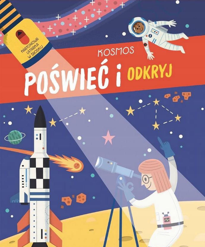 Wyjmij tekturową latarkę z kieszeni na pierwszej stronie. Wyrusz w przestrzeń kosmiczną u boku astronauty.
